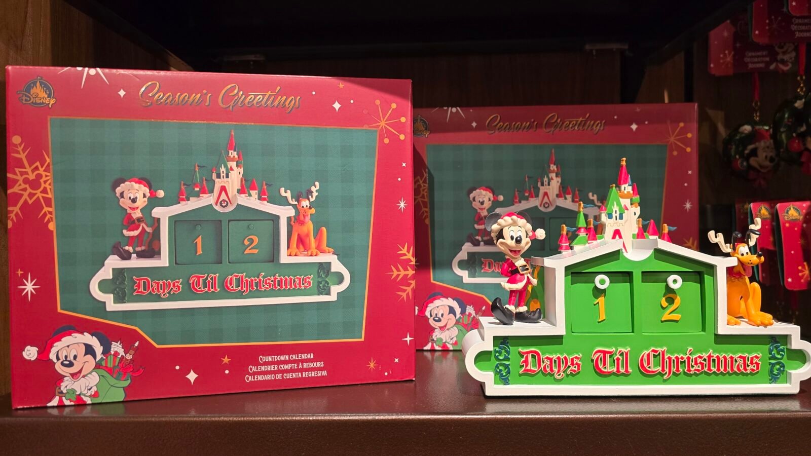 Mark the milestones to the big day with this fully sculpted Santa Mickey and ”reindeer” Pluto countdown calendar topped by a decorative storybook castle. It answers the question ”How much longer?” with more than a touch of holiday magic!
