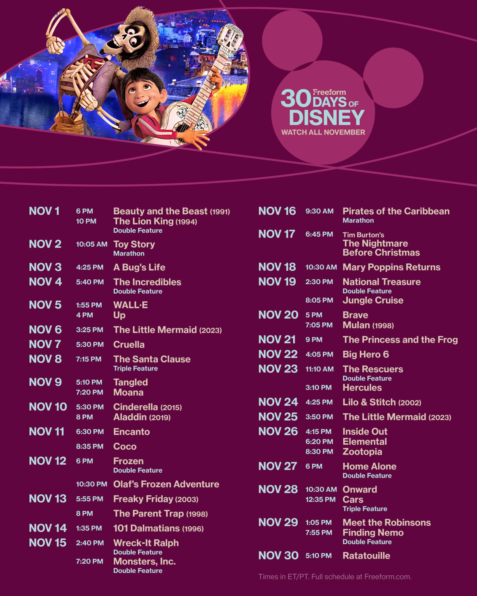 Freeform ’30 Days of Disney’ Announced for November 2025. The Disney marathon you’ve been waiting for is here! Grab some hot cocoa, cozy up with a blanket, and get ready to fall into Freeform’s “30 Days of Disney” with a month-long celebration full of Disney nostalgic classics and modern hits. Last November’s event reached nearly 25 million viewers.
