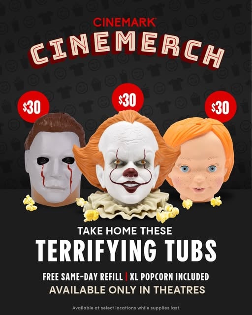 Our terrifying popcorn tubs are here to slay” and have re-released the Chucky Head, along with Pennywise Head Popcorn Buckets. Each Horror Head popcorn bucket is listed for $30.00 and is only available at Cinemark theaters at this price. Pennywise and Chucky are available online through Cinemark Shop, with prices and descriptions below.