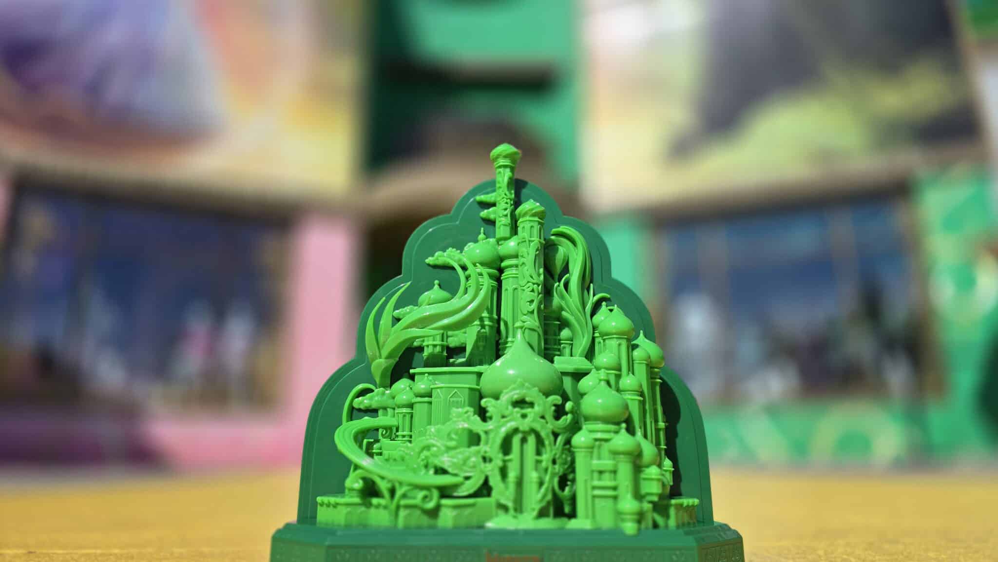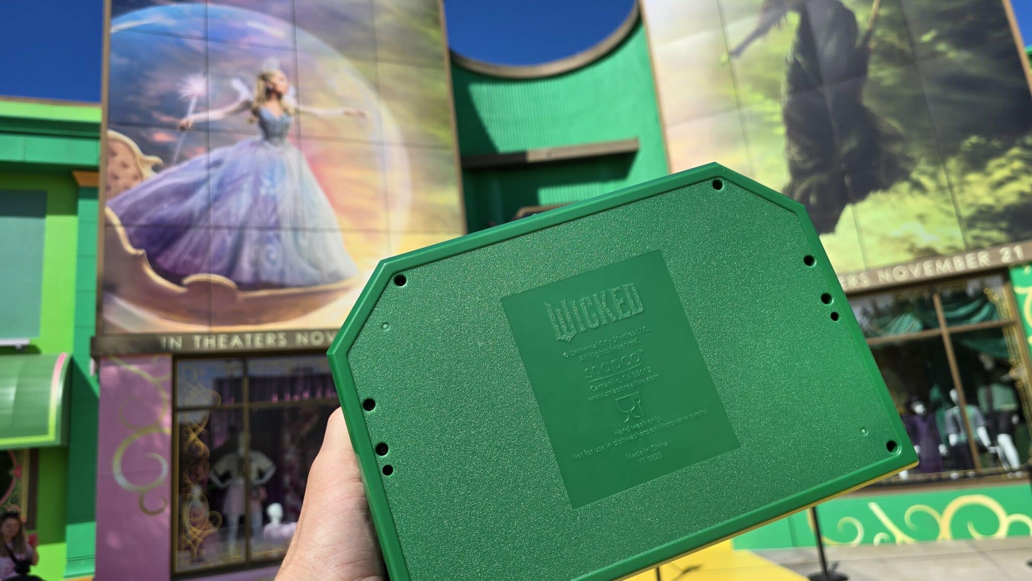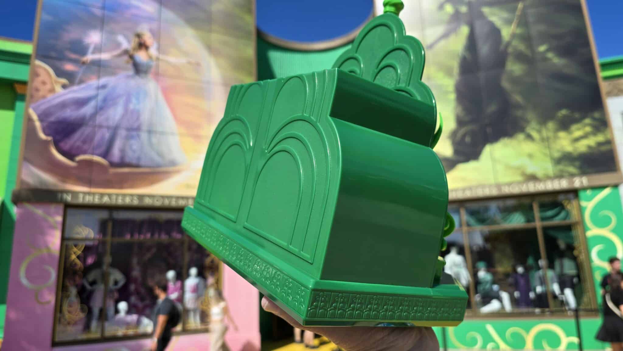 The Emerald City Wicked: For Good popcorn bucket from Cinemark looks really good. The front city artwork is very intricate, with a 3D city of Emerald in the land of Oz on the front. It was priced at $47.95, and after ta,x the total was $51.07. We were lucky to be by the front entrance to Universal Studios, where Wicked: The Experience is ongoing, and took some photos.