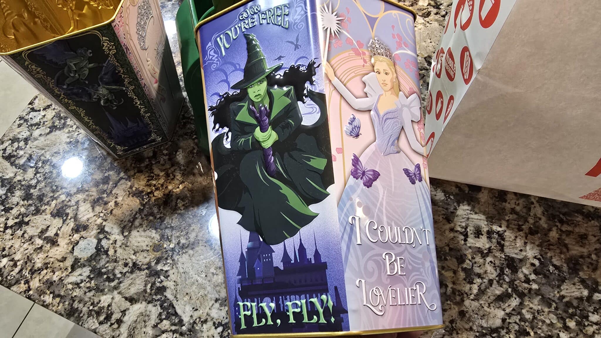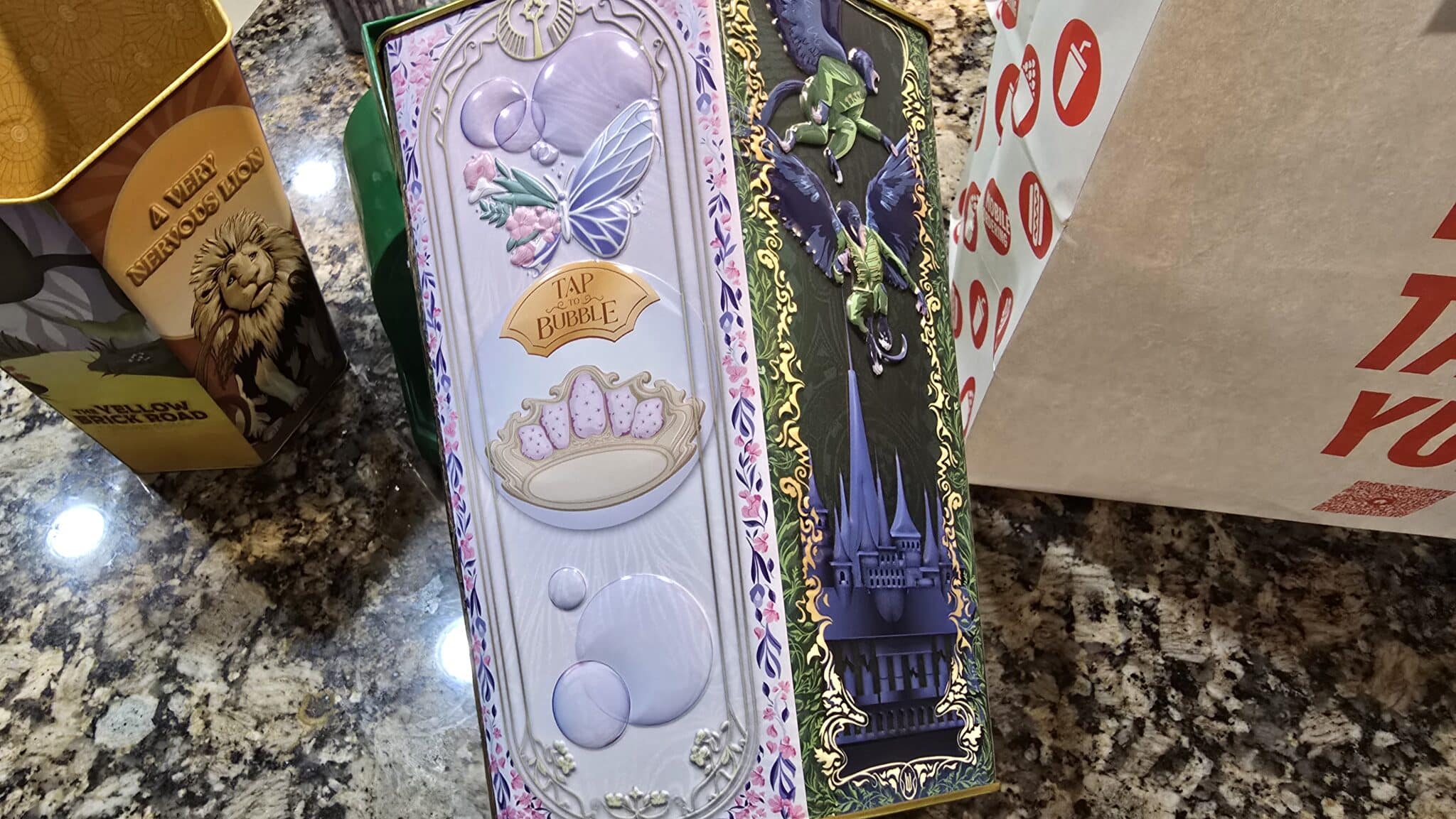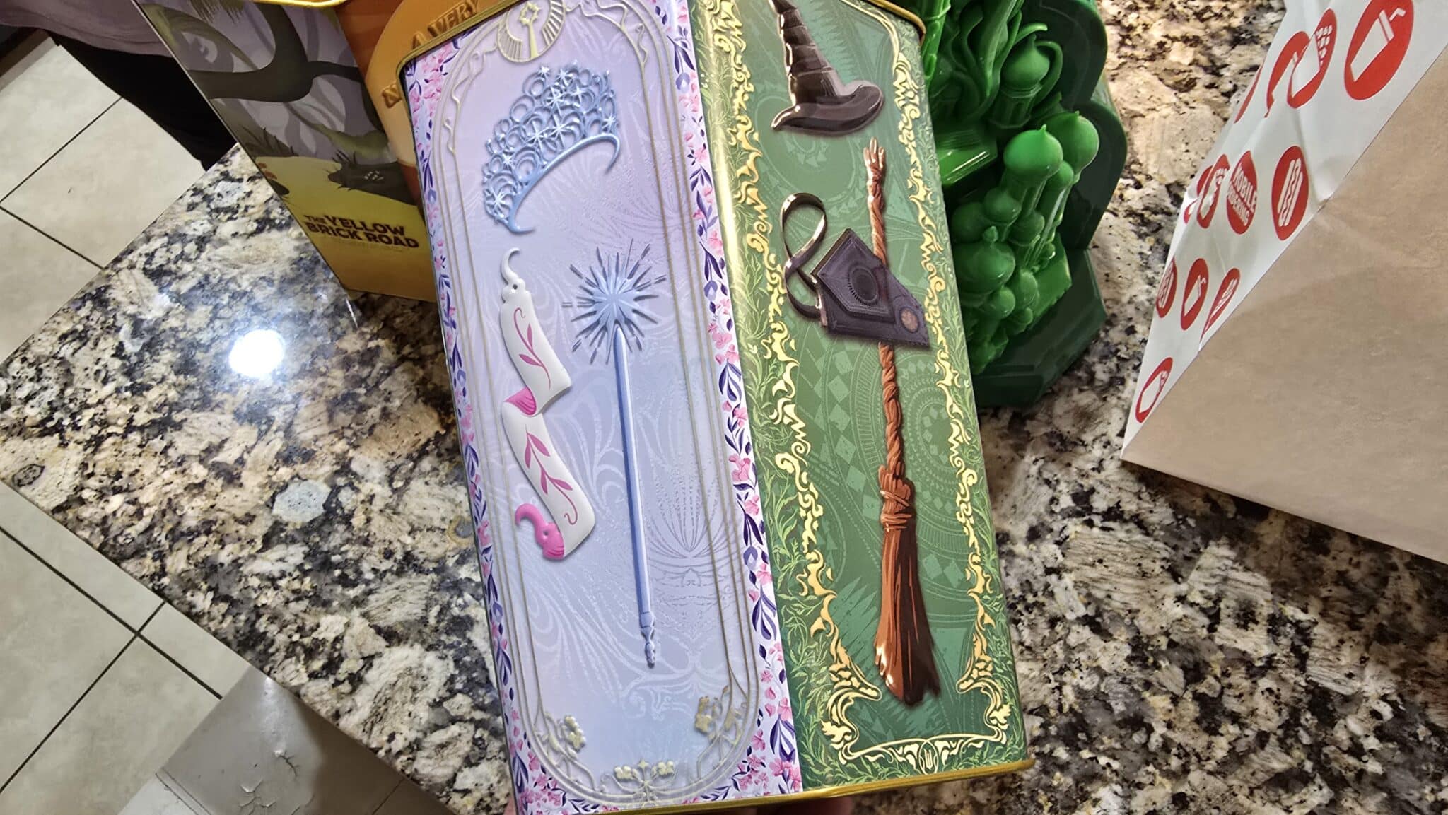 We went to the Cinemark at Universal Orlando’s CityWalk and picked up the Emerald City Wicked Popcorn Bucket. They did have two different Hexagon Wicked For Good popcorn tins available. Previously, Cinemark had only announced one Hexagon. The Yellow Brick Road character popcorn tin was known, but the Witches Hexagon Popcorn bucket tin is new. The new Tin has “Tap to Bubble” and “Glinda” & “Elphaba”. See images below.