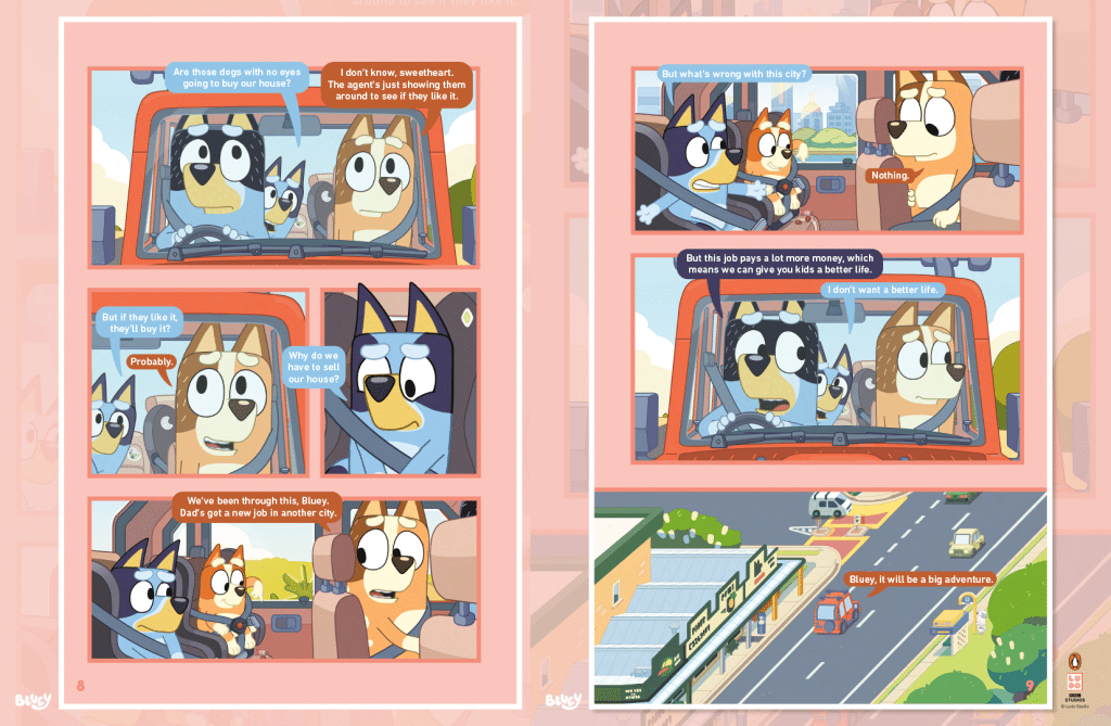 With a striking embossed high-gloss cover and full-colour interiors, this deluxe comic-style chapter book will be a fan favourite for readers of all ages. Bluey: The Sign book is available now. It has 144 pages, and the “age range” is 7 to 10. We expect it to truly be for all ages! The book is now available wherever books are sold.