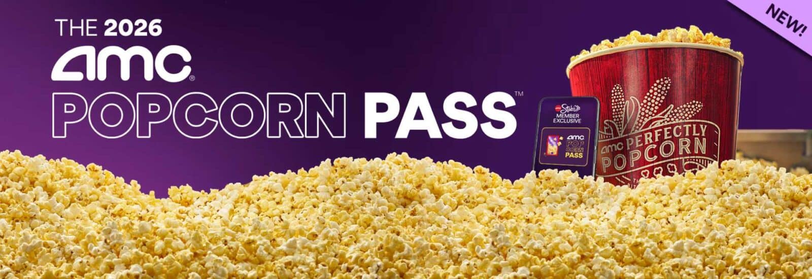 AMC Theatres Introduces New Popcorn Pass for 2026. Want 50% off every large popcorn you buy in 2026? AMC Theatres has started selling the new Popcorn Pass for 2026. AMC is the world’s leading seller of movie theatre popcorn. The new Popcorn Pass at AMC Theatres costs $29.99 through December 31, 2026.