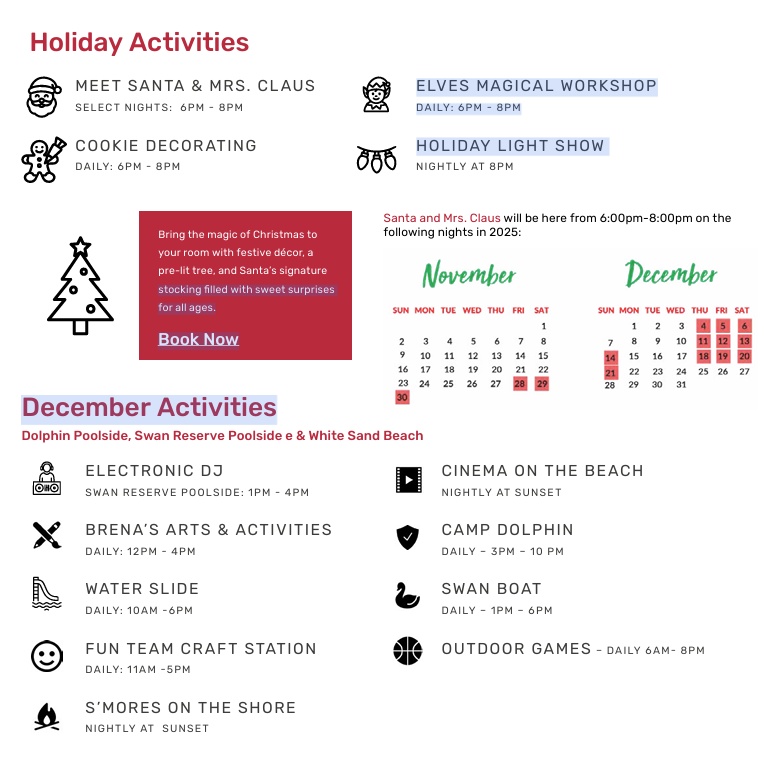 For the full list of holiday activities in and around the complex, guests can visit the Walt Disney World Swan and Dolphin Holiday Happenings Guidebook. Highlights include: