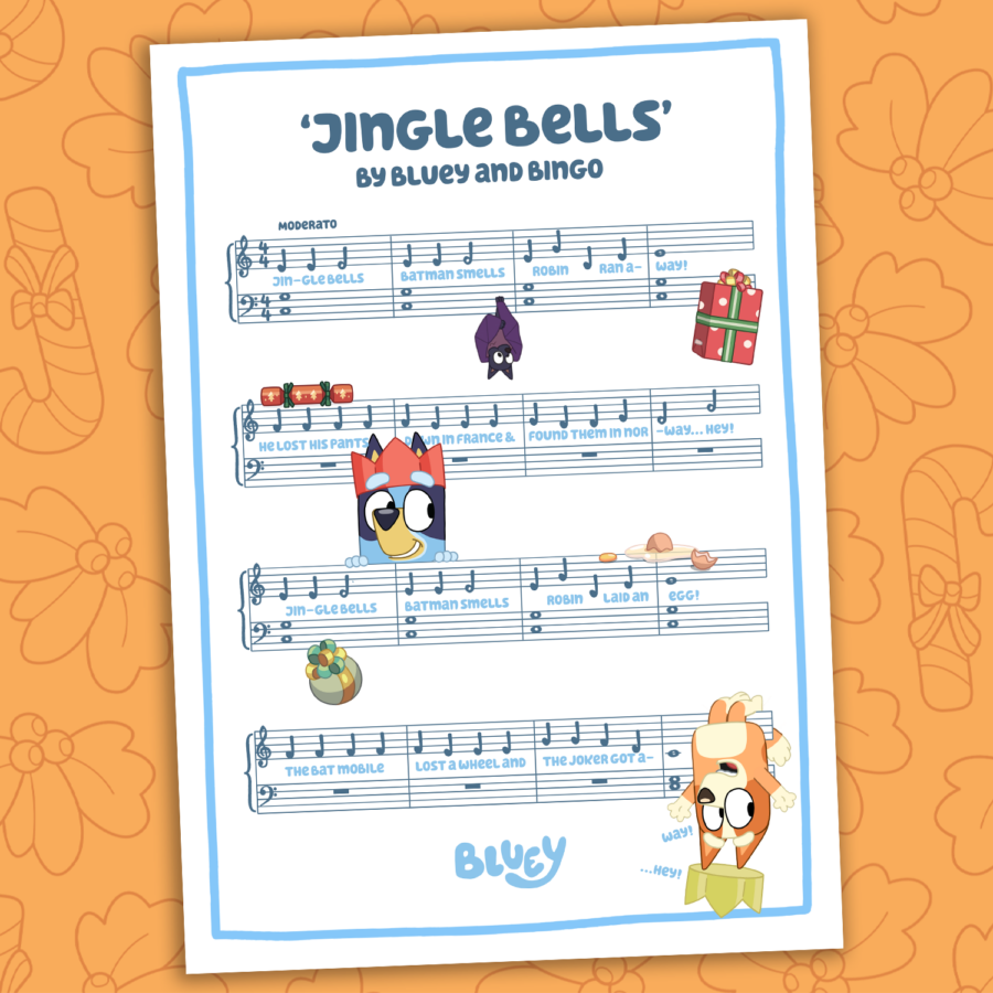 Bluey, Bingo & Lucky are playing backyard cricket when they hear the sounds of Jingle Bells being played in Lucky’s house. On further investigation, they find Lucky’s Dad teaching Chucky the piano. Jingle Bell lyrics, which you can see below, have been rewritten by Bluey and Bingo!