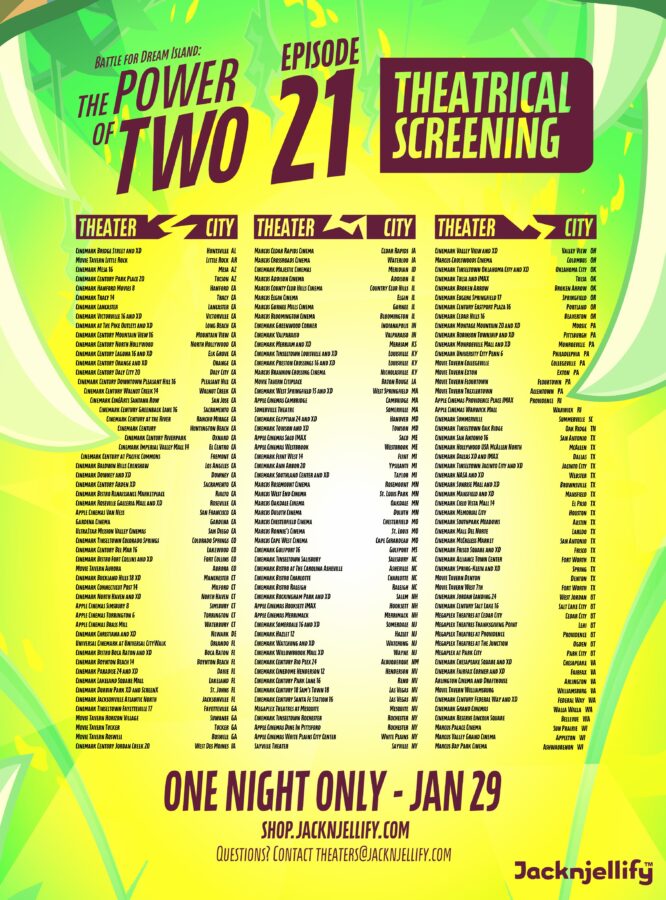 Updated January 11, 2026 – JacknJellify Social Media has officially announced the dates and ticket on-sale date. “Experience the premiere of Battle for Dream Island: TPOT 21 at select theaters across the U.S on January 29th, 2026! The aftermath of One’s takeover finds our contestants in another Insectophobe’s Nightmare! Tickets go on sale January 16th, 2026! #BFDI #TPOT