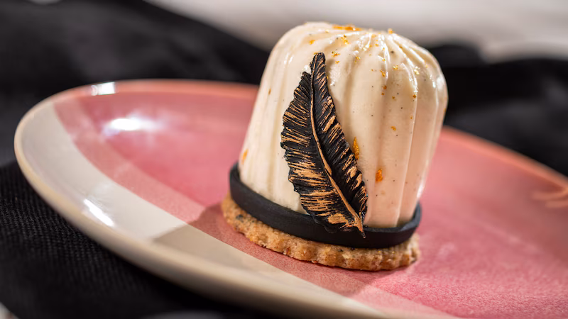 Sparkling Spectacle Gâteau: Vanilla Bean Mousse with a Golden Caramel Center and Apricot Jam on a Hazelnut Cookie—from Deco Delights near Port of Entry.