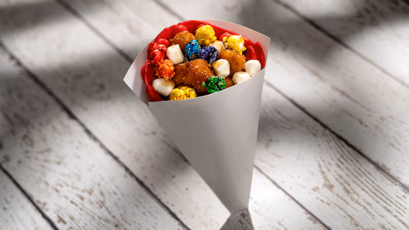Popcorn, Popcorn Chicken and Waffles: Rainbow Popcorn, Popcorn Chicken, Mini Mozzarella and Maple Syrup—from Figment’s Inspiration Station at The Odyssey