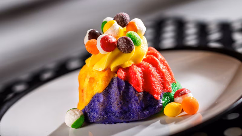 Color Scheme Cake: Fruity-Flavored Rainbow-Hued Cake topped with Skittles® POP’d Original and Sour Freeze Dried Candy—from Figment’s Inspiration Station at The Odyssey