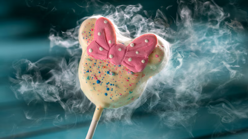 Liquid Nitrogen Minnie Cake Pop: Cotton Candy Sponge Cake, White Chocolate Ganache, and Colorful Chocolate Splats—from Swirled Showcase located on the Walkway between World Showcase and the Imagination! Pavilion