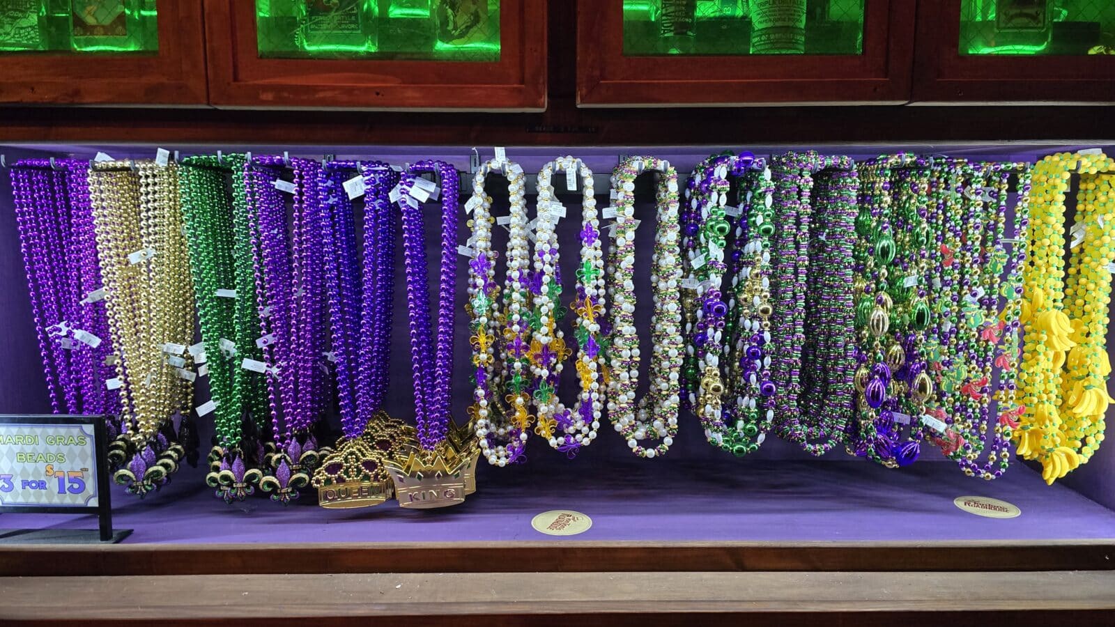 • The Vibe: Mardi Gras beads dangle from the rafters over a vintage bar counter.