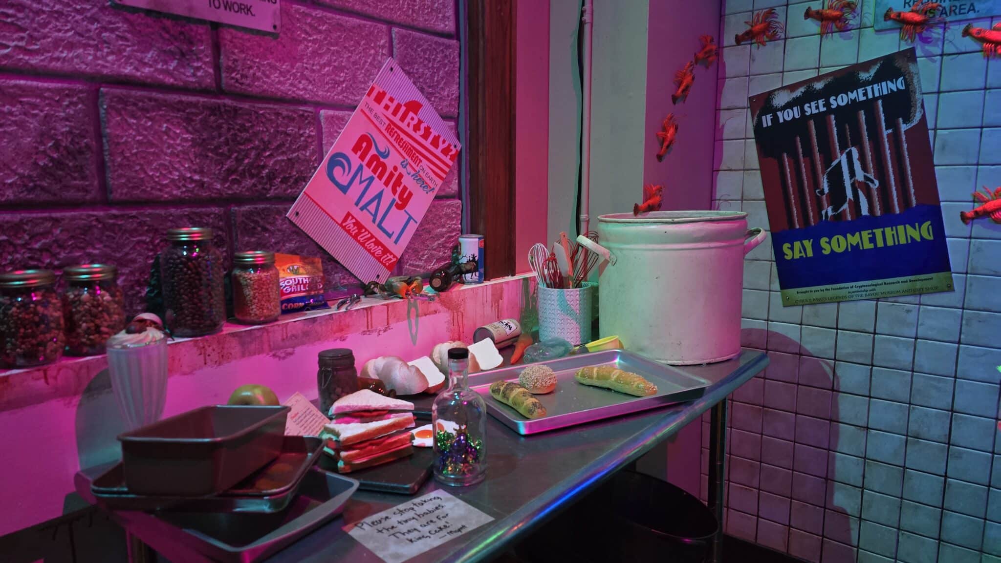 • The Decor: Keep an eye out for “Never Clear” and “Gator Shine” posters, alongside advertisements for local legends like Gregory & the Ten Ton Tikis.