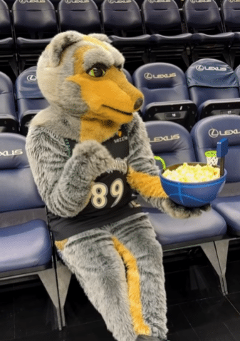 Crunch the Wolf showed off the new Timberwolves basketball popcorn bucket today in a reel posted by Levy. Our only question is, how did he miss that shot?