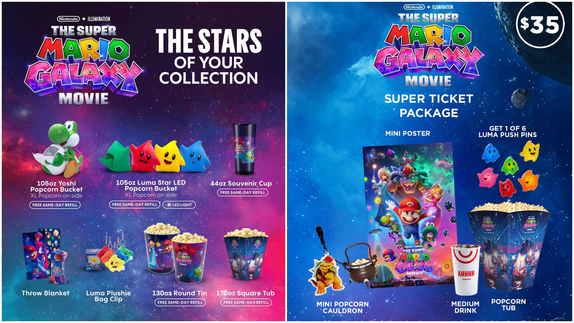 The Super Ticket Package includes six items: a Mini Popcorn Cauldron with a Bowser keychain attached, a Mini Poster featuring the film’s theatrical art, 1 of 6 collectible Luma Push Pins (randomly assigned from blue, green, yellow, red, orange, and pink Luma figures), a Medium Drink, and a Popcorn Tub.