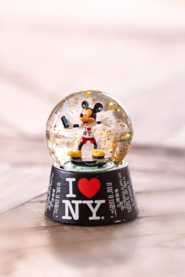 A pair of NYC mini snow globes round out the exclusive collectibles — one showing Minnie Mouse as Lady Liberty surrounded by gold glitter, the other featuring Mickey Mouse taking in the city. Both are designed as display souvenirs.