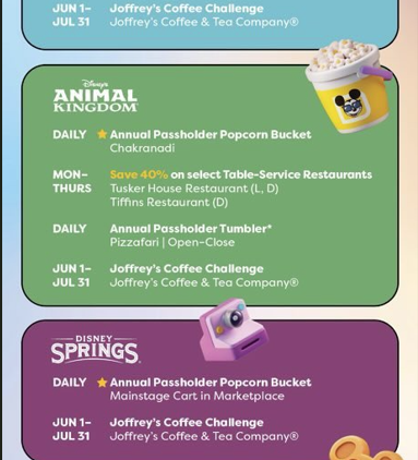 The Annual Passholder Popcorn Bucket is coming to Walt Disney World this summer as part of V.I.PASSHOLDER Summer Days 2026, running May 1 through July 31, 2026, and it is one of several brand-new offerings confirmed in the just-released official perk breakdown. The full graphic reveals daily perks, restaurant discounts, and a Joffrey’s Coffee Challenge across every park, giving Annual Passholders one of the most detailed summer schedules the program has ever published this far in advance.