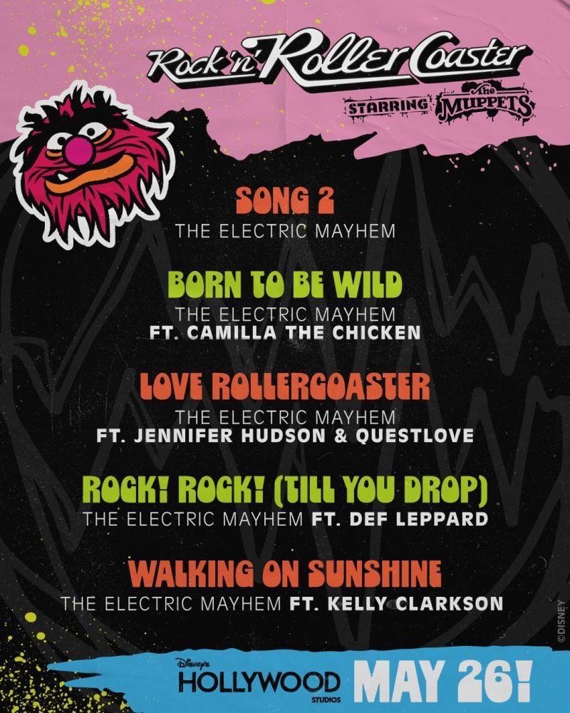 Disney has just dropped the opening date for Rock ‘n’ Roller Coaster Starring The Muppets and revealed the complete five-song Electric Mayhem set list. The attraction officially opens May 26 at Disney’s Hollywood Studios, and the lineup of tracks is bigger than we expected.